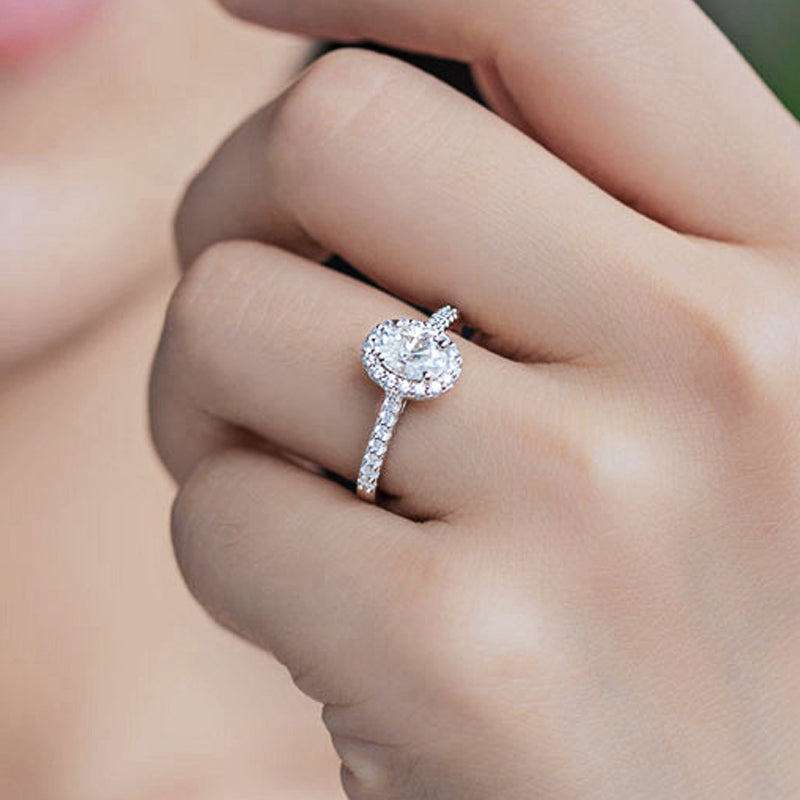 Her heart will flutter at the site of a sparkling 1.0 carat, oval-shaped center diamond framed by a halo of pave'-set side stones to add further lavishness to the design. The shank of the ring also features 1 row of micropavé Zircon stones. These stones are set in high polished 925 sterling silver to provide the ideal shine for wedding jewelry.